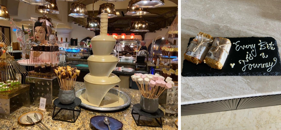 That afternoon Helen took a tour of the Shangri-La Qaryat Al Beri Hotel with breathtaking views of Khar Al Marqta Creek. “The hotel has its own gondolas that take guests to the local shopping mall!” Helen enthuses, “We enjoyed wonderful cocktails in the bar watching the sunset, with an evening meal to follow.”