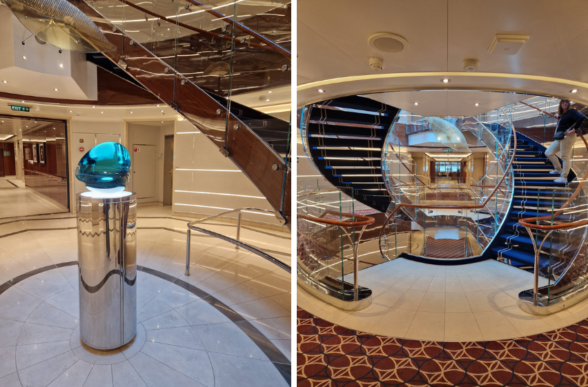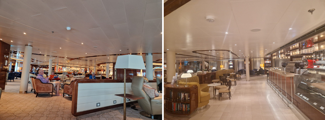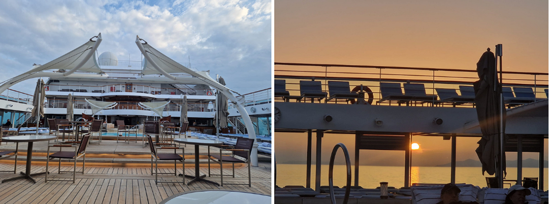 This sociable space is an open, comfortable environment in which to enjoy a barista coffee, light snacks, or ship-made gelato, mingling with fellow guests, having a bit of down time or chatting with Guest Services. The adjoining library provides a quiet place to browse the onboard books or catch up with the news. “There are plenty of sunbeds and seating areas around the pool,” says Rose, “as well as lots of places to relax inside with a drink and a book.”