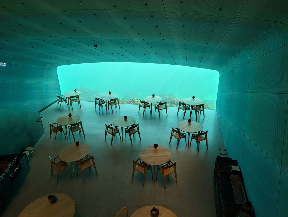 After lunch and a stroll our last stop on the tour was at Under, a Michelin Star status underwater restaurant where the dining room is 5.5 meters below the sea level! With floor to ceiling glass windows can see fish swimming in the water and seals visit on occasion. Their 12-course dinner would cost around £150pp without drinks!